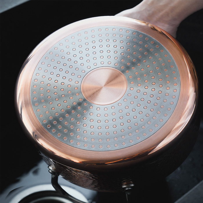 三層鍋體一體壓制成型,工藝更精細,結實耐用,復合鍋底導熱均勻,節能高效,同時克服銅鍋缺點,可適用于所有爐具
